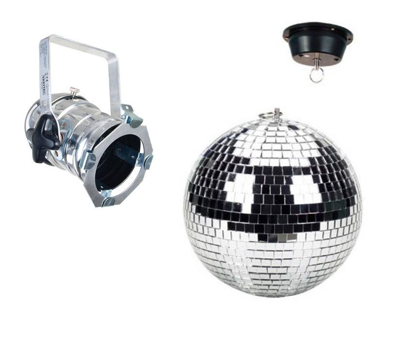 Ce pack comprend une boule à facettes de 30 cm, son moteur alimenté via une pile électrique et un PAR 36 pour projeter une lumière blanche et diffuse sur la boule à facettes.